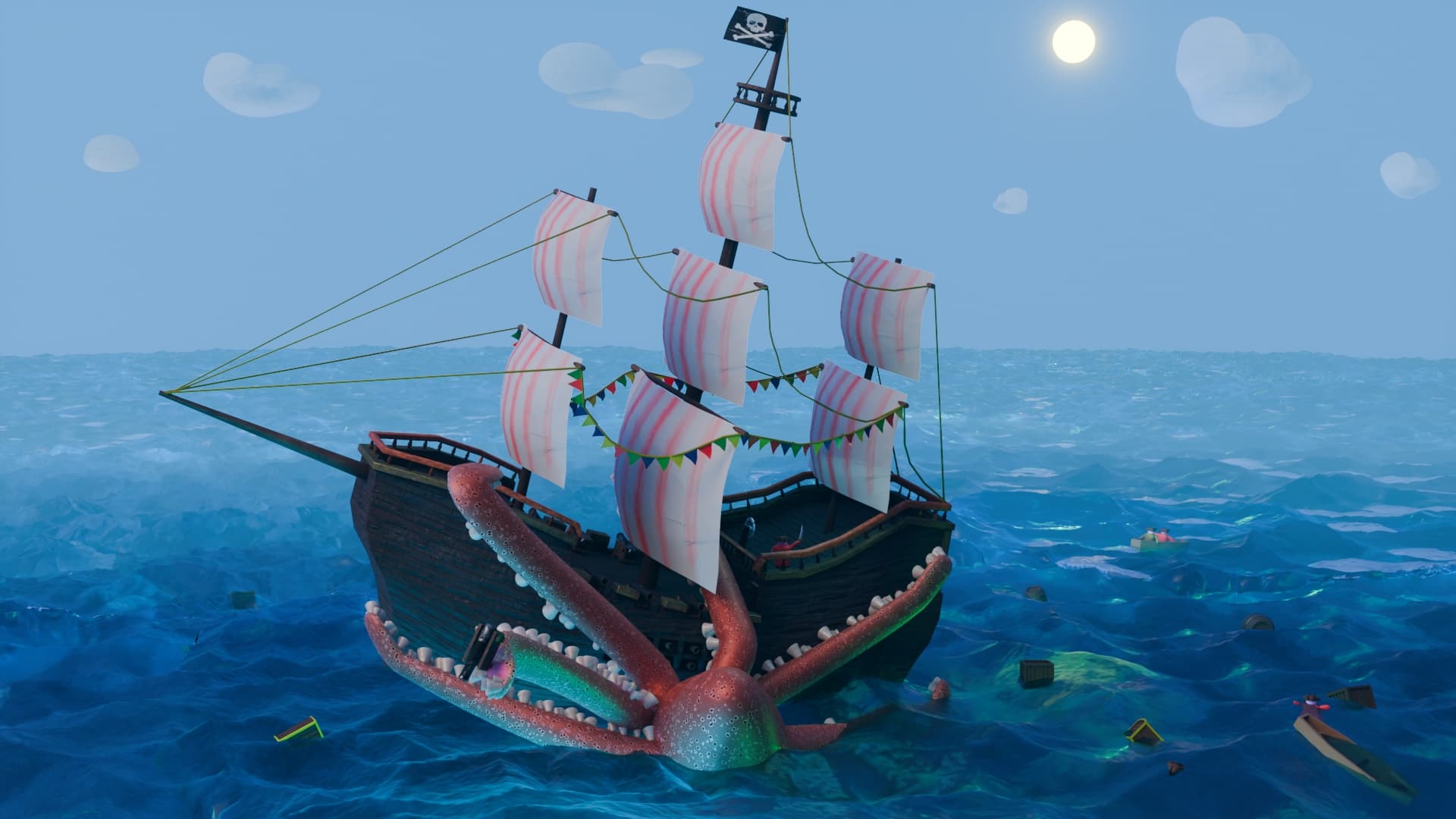 Srl1 - Nice graphic style, more like a painting or something, the sea gives that feeling. Perhaps the project was too complex for a week, because the scene is packed with detail. You could also take a look at the colors, because you wouldn’t expect that on a pirate ship.