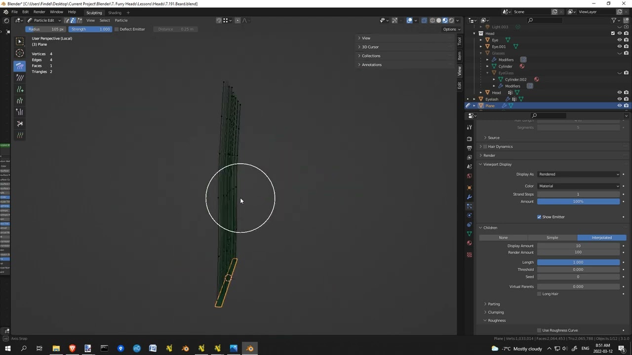 I was using the eyebrow and shrinkwrap lesson as my base to create eyelashes. Once everything was in order I began to try to apply Particle edit to it (after grouping its vertices, after weight painting, after mirror modifying it, after adding a particle emitter). When coming everything would “shrink”. They would flee from the comb rather than embracing it (the ungrateful hairs).