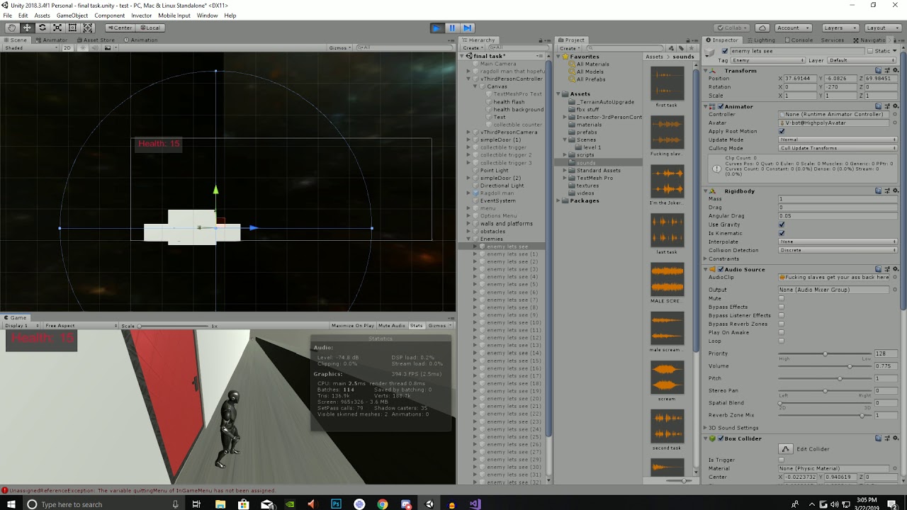 I’m wondering if this is an issue with the code, for instance, an audio source gets started every few milliseconds. Or maybe the audio source gets slowed down. At some point, we set Time.timeScale to 0f.