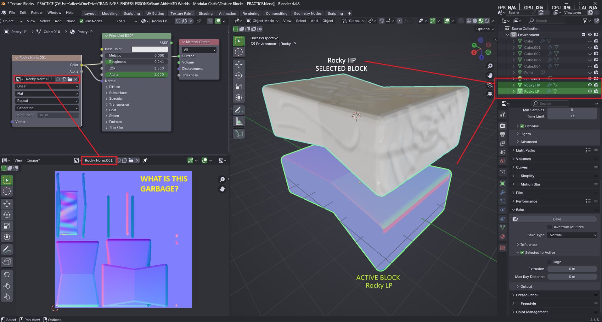 I have a real issue with baking my normal maps. I’m in Grant’s 3D Environment course and I’m revisiting the Baking of Normals as it went a little wrong during the course, but I battled on.