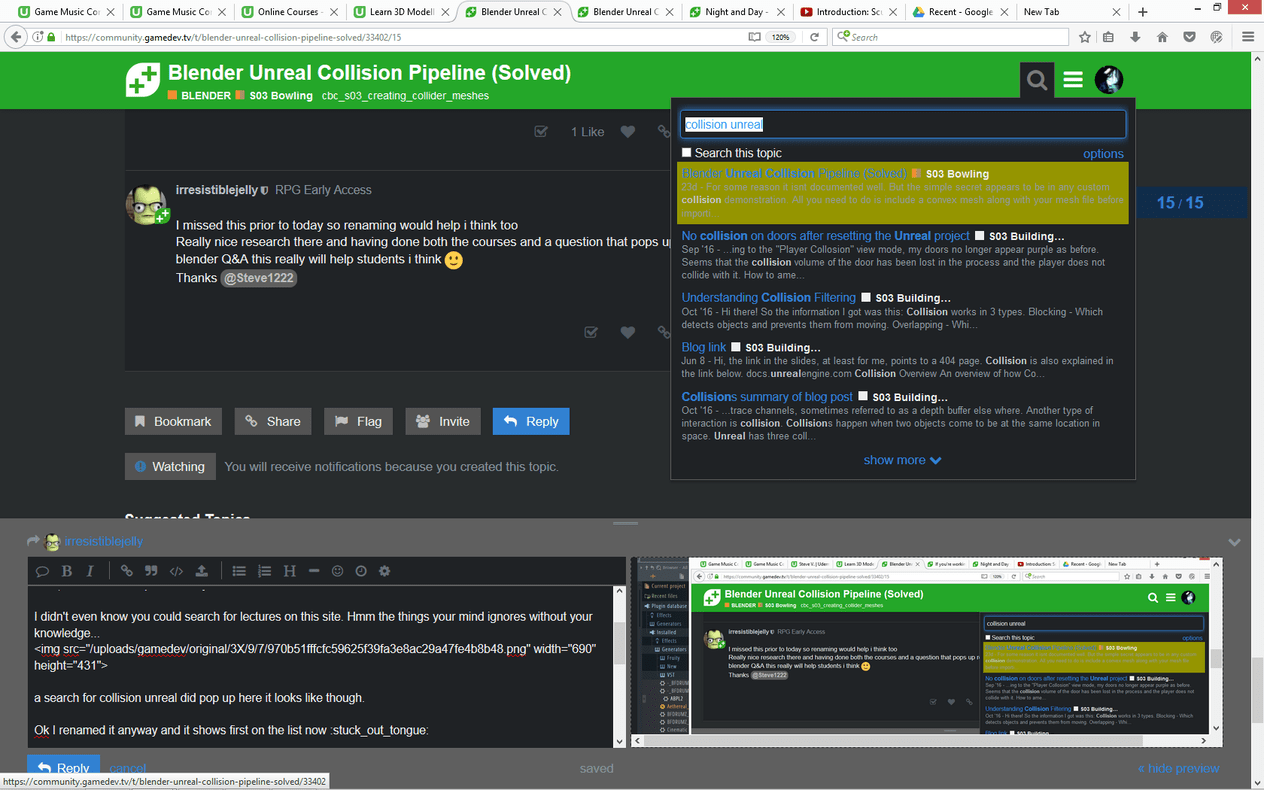 Not sure what you have in mind but I did intend the suggestion to be for this “creating_collider_meshes” (lecture 51) that you, Ben made, in the blender course. It could be useful in the unreal course too, but its more important for someone following the modeling course trying to get the files into unreal, since it was so hard for me to find this information despite it being a fairly simple solution.