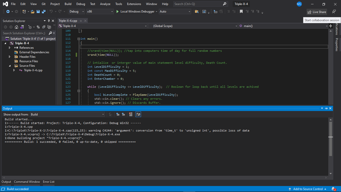Triple-X-5A was a cloned from Triple-X-4 and is dependent on Triple-X-4 and complies out as Triple-X-4. I eliminated some of the print to screen or cout lines to get a better view of the program in Triple-X-5A. Without A5 I have a C 4244 error now I was using A5 to trouble shoot 4. Here is a screen shot of Triple-X-4 with the error code. ( Triple-X-5A will not run without Triple-X-4). I can send more screenshot of Triple-X-4 if you want to cut down on confusion. Presently remove and have Triple-X-5A stored on C drive.