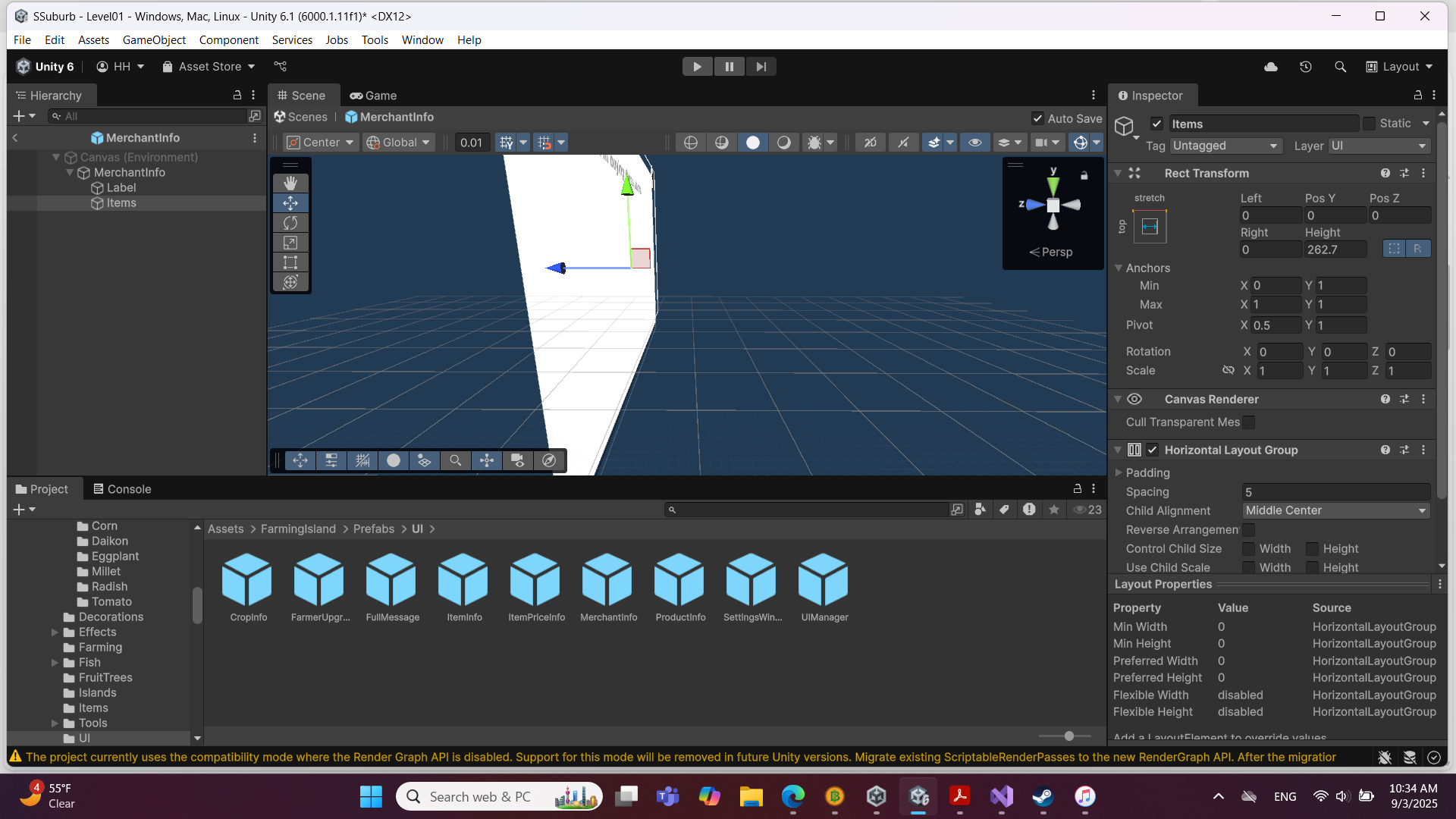 In my game demo I’m wondering what could be wrong with my UI as items don’t seem to appear when I’m in Play Mode. The scripts shouldn’t be an issue; I tried adjusting the Z axis on the item child and enabling Control Child Size and Control Force Expand. I’m not sure how else to troubleshoot. I’ll provide some pictures for context…any feedback would be appreciated.