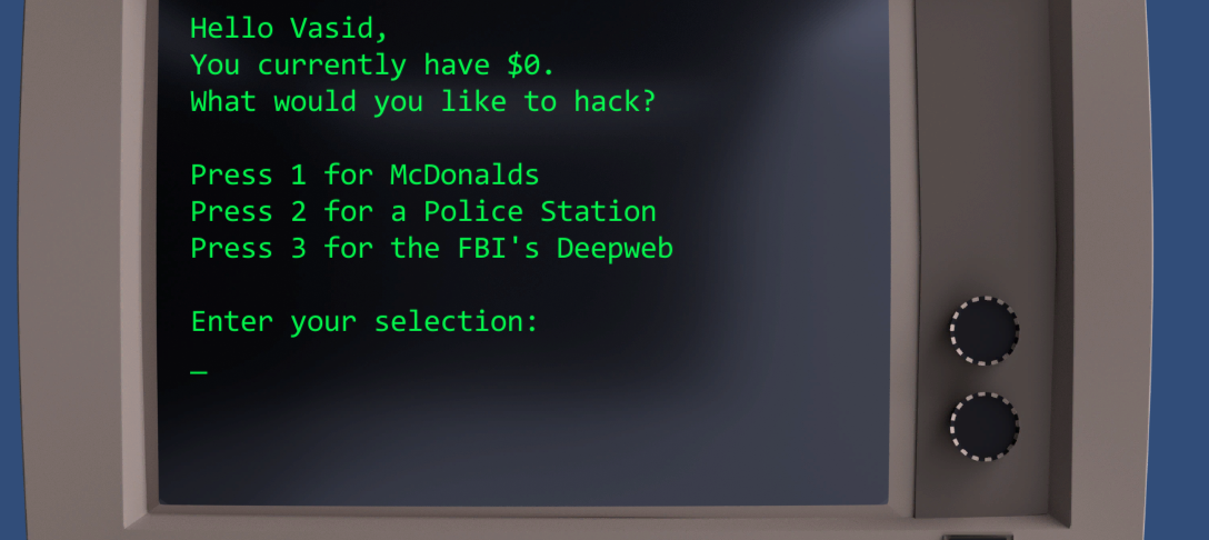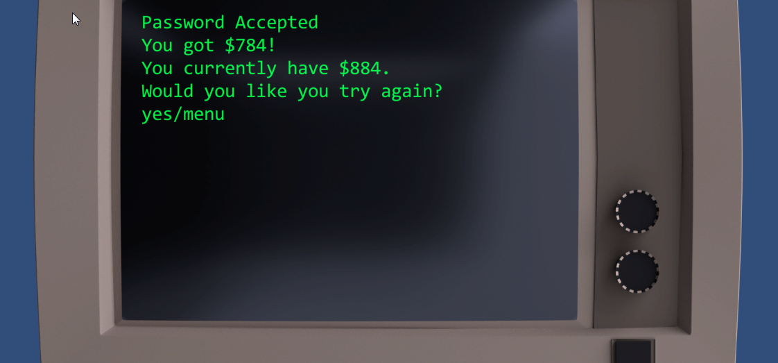 I decided that I wasn’t really interested in making ASCII art, and would rather put sort of a point system into the game to give the player something to look back on after they’d hacked a thousand mainframes, after all this was something I enjoyed when I played Shadowrun on the Sega Genesis. So, I added a public variable called cash as well as a local variable called reward. I generate the reward with a random range based on the level (higher levels generate more obviously) and the cash keeps adding up and appears anytime the player wins or goes to the main screen (or types “cash”). I made cash public so theoretically at some point in the future it can be used outside of the terminal.