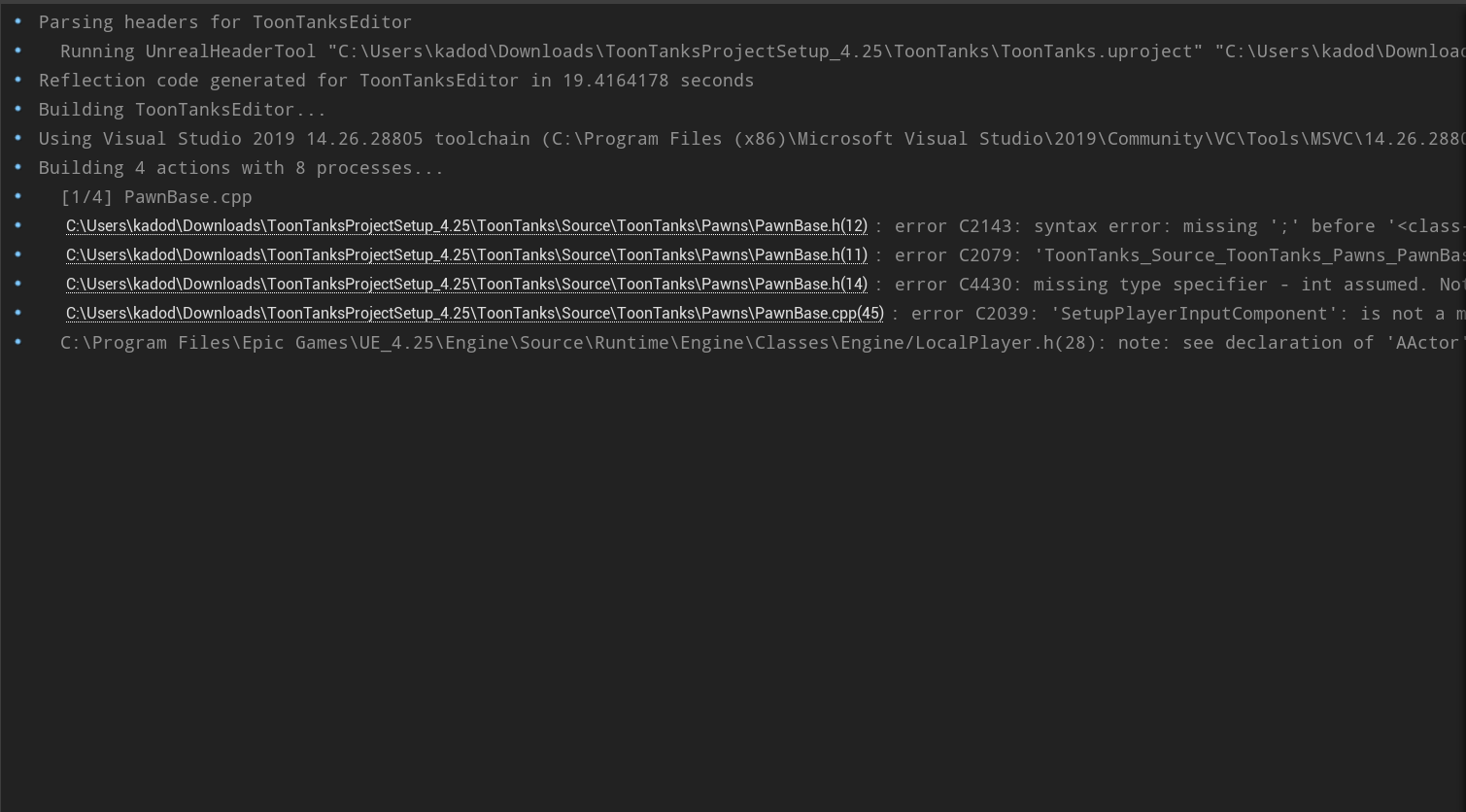 Running UnrealHeaderTool “C:\Users\kadod\Downloads\ToonTanksProjectSetup_4.25\ToonTanks\ToonTanks.uproject” “C:\Users\kadod\Downloads\ToonTanksProjectSetup_4.25\ToonTanks\Intermediate\Build\Win64\ToonTanksEditor\Development\ToonTanksEditor.uhtmanifest” -LogCmds=“loginit warning, logexit warning, logdatabase error” -Unattended -WarningsAsErrors -abslog=“C:\Users\kadod\AppData\Local\UnrealBuildTool\Log_UHT.txt” -installed