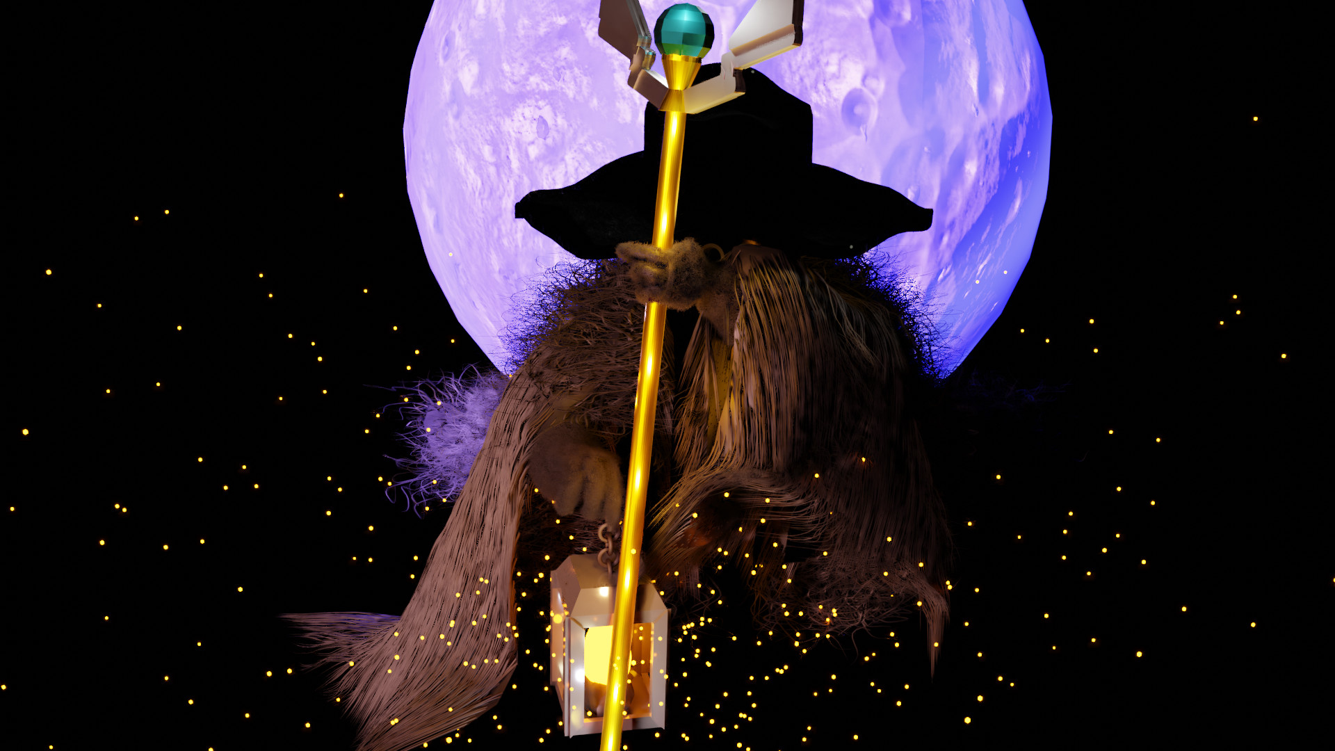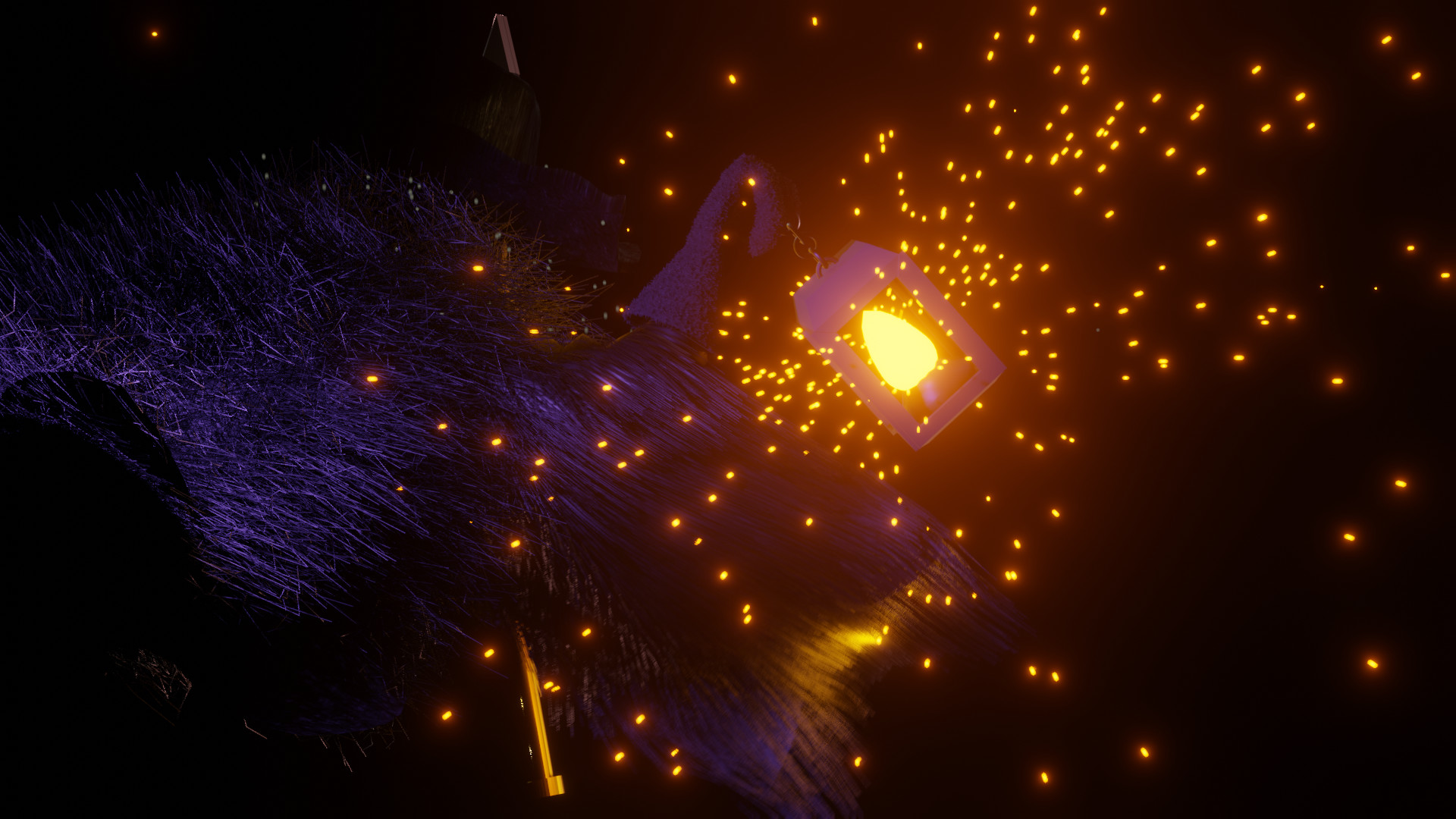 It’s a simple particle system with an icosphere used as object reference for the particles with the same emissive material of the flame inside the lantern, and some speed settings adjusted