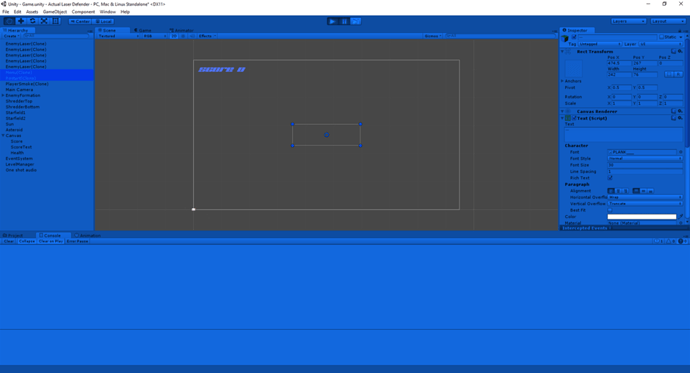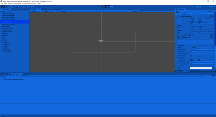So I thought it would be cool if the “Play Again” and “Menu” buttons appeared in the same scene when the player ship is destroyed. I made two different text gameobjects, made sure they take you to the correct scene, made them prefabs, and instantiated them in the player script after health hits 0, using: