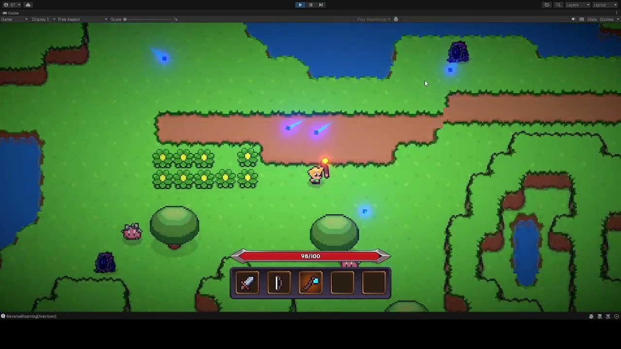 A few touches of my own I’ve added: The Health bar for the player, a custom enemy from an asset pack, and I slipped in a waterfall effect.