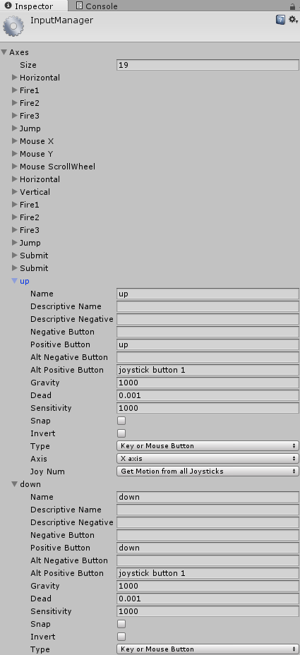 Here’s how I fixed this (it might not be the right way!). Go into Edit -> Project Settings -> Input. This should take you to the Unity Input Manager. Expand the axes tab and change the size number to 20 or so to add some new blank entries. Change one of the new entry’s name to “up” and the other’s to “down”. In each entry’s positive button section, type “up” and “down” respectively. It should look something like below: