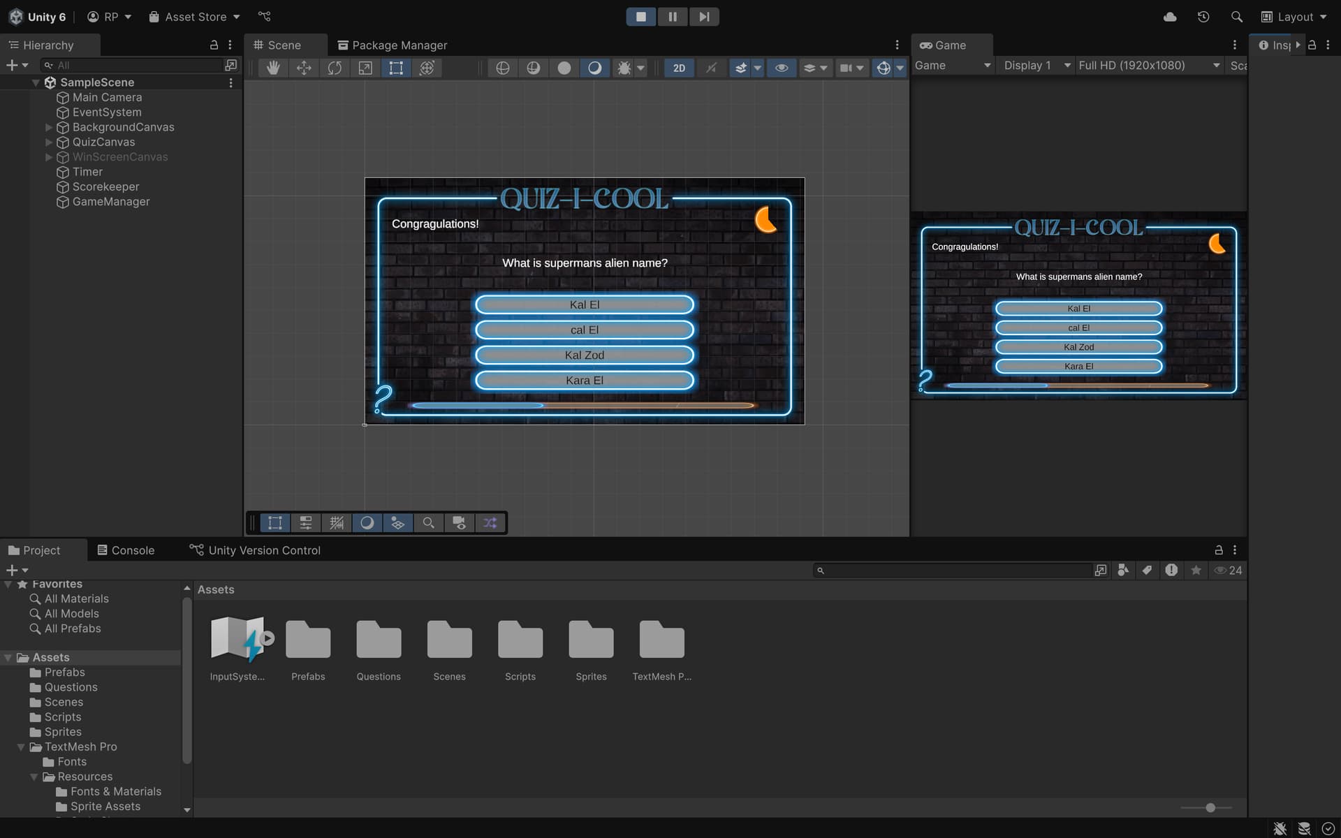 QuizMaster Learned Scriptable Objects, Canvas(UI, Text, Buttons,SLiders), SceneManagment. |