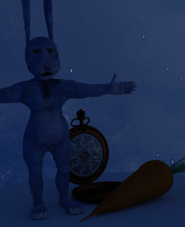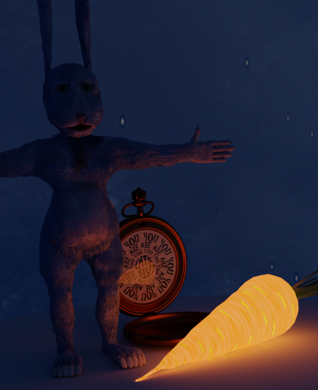 That glowing carrot looks great; really completes that scene. or is it just the drugs again… the numbers are morphing into letters! I think i might be an impatient bunny whos worried about time all the time! ah! im too too late! too too late!