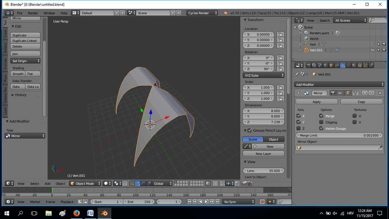 Then without using mirror modifier to get the rest of the arch, I duplicated an item and rotated it by 90 on Z axis, and of course I ended up with this image:
