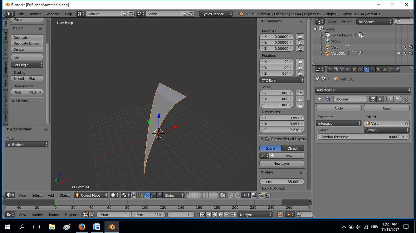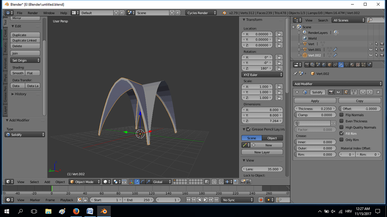 Then I used Boolean Modifier but not to original arch (vert) but coppied one(vert.001) and not Union option but INTERSECT and after hiding original file this is what I got left with