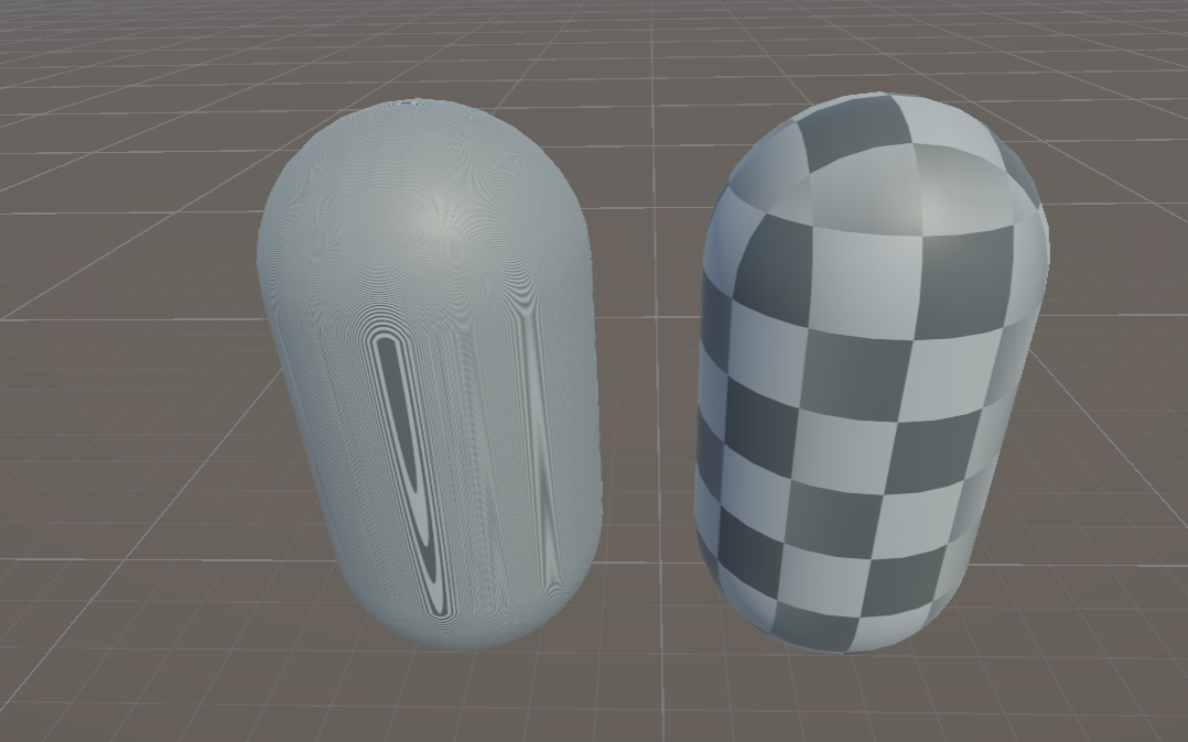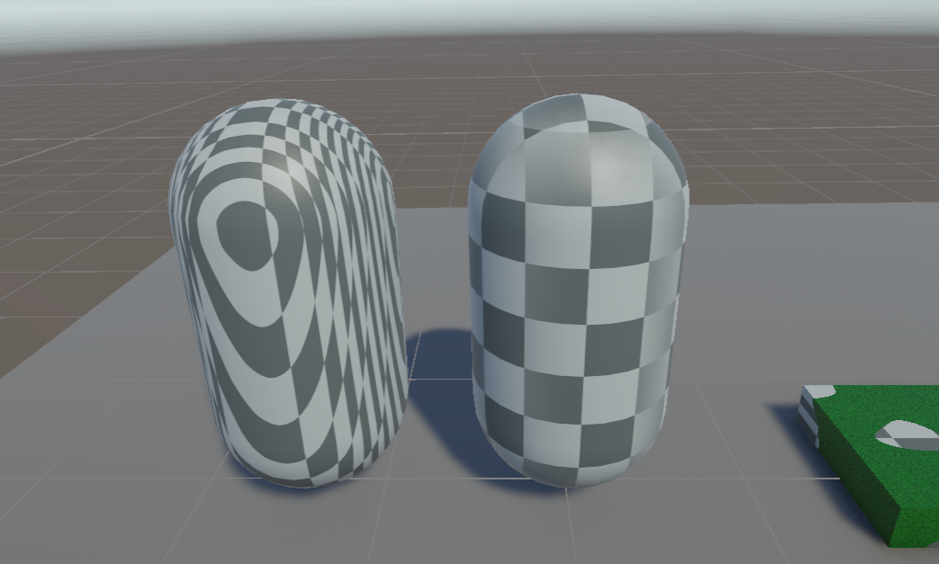 I tried making making a simple triplanar shader that applies an albedo texture. The capsule on the left uses the custom node we built, the one on the right uses the built-in triplanar node. I used a checkerboard texture to clearly illustrate the distortion. The blend value is set to 2. The first image is at ground level: