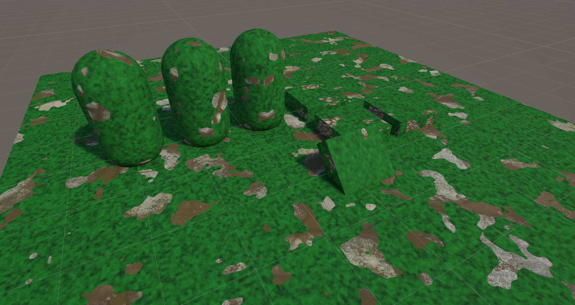 Finally, here’s ground level again, but with the blend value set to 25. It mostly looks reasonable, apart from the severe distortion around where the normals make an angle of 45 degrees between the world axes - there it tiles rapidly.