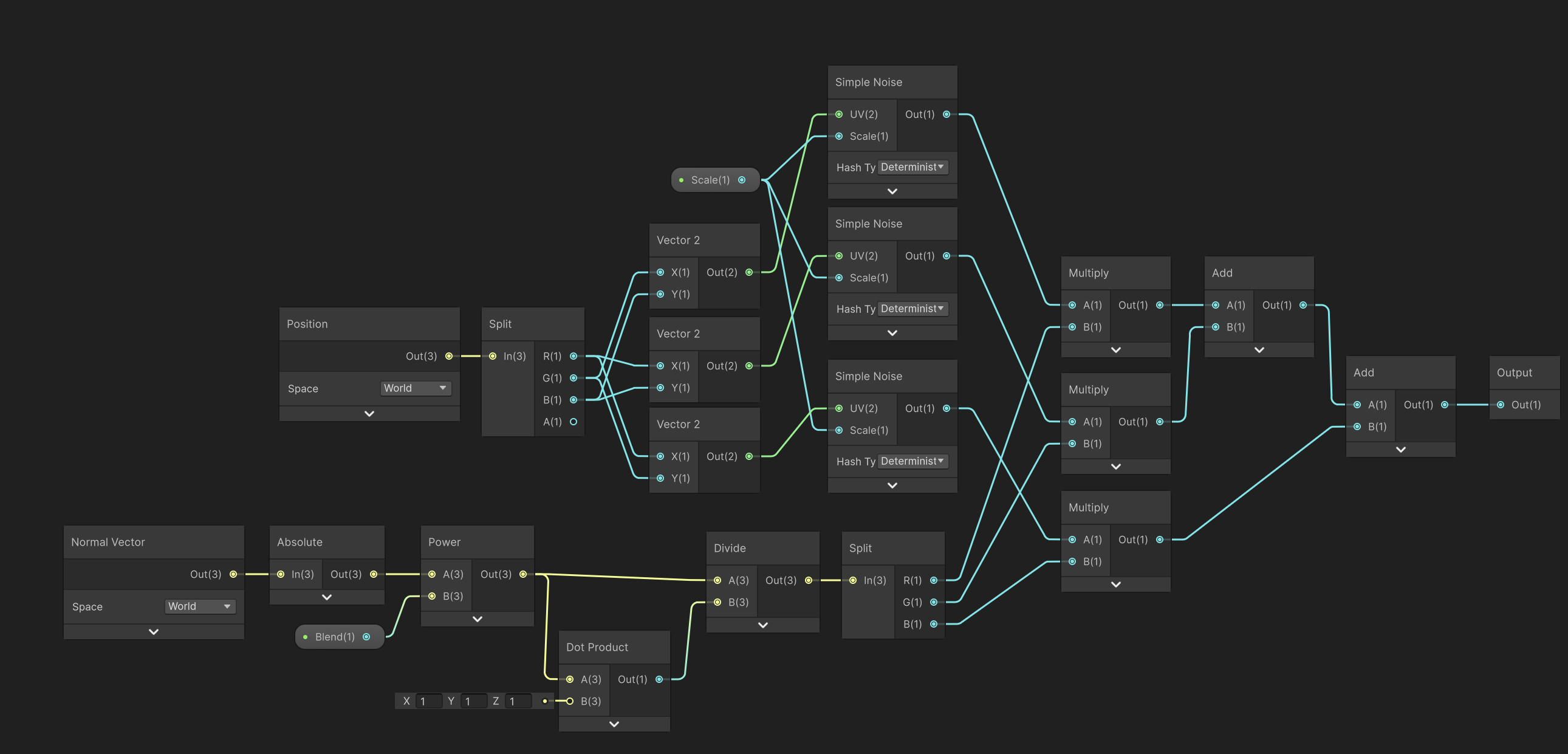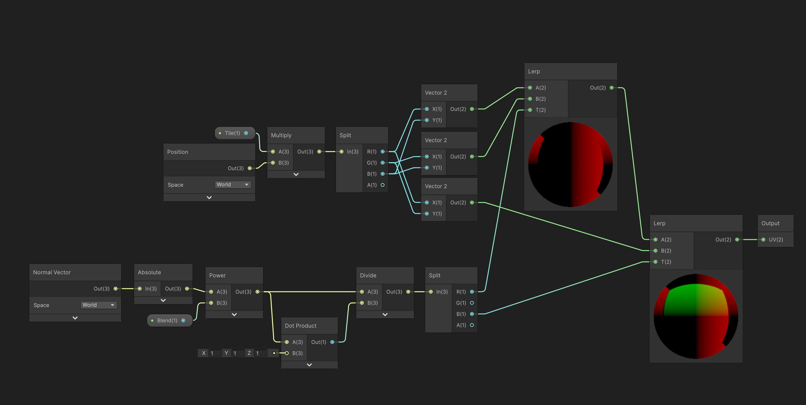 For reference, here is my triplanar subgraph. I multiply the position by a “Tile” factor, which is set to 1 in all these examples, but should otherwise be the same as the course implementation.