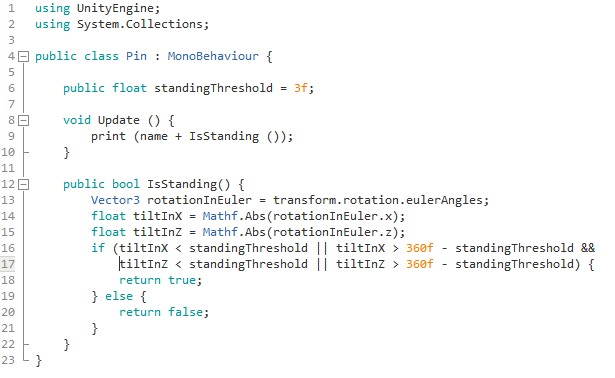Yeah this sees to work well. I’m not sure if its because I modeled my own pins, I noticed in a later lecture that when the nested bowling pin was reduced to a single gameobject that Ben’s ended up on its side, mine stayed upright so obviously I didn’t need to change any code to continue counting the pins correctly. Now i just have to get my ball to not slow down as much, or actually fly straight through the pins without actually moving them lol.