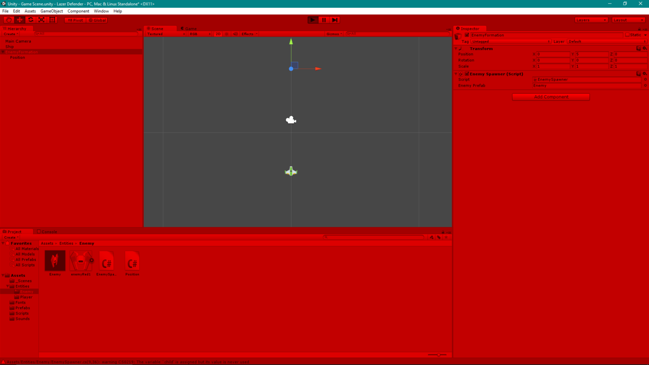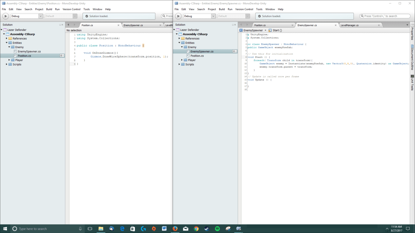My brother Evan and I have been doing this class and have been succeeding and learning a lot this past summer, but recently we tried to run the Lazer Defender game and we are running into an error that causes Unity to freeze. This is very frustrating. I’m including a screen shot of the screen when it freezes and our code. We are only at lesson 7 of 30 and any help would be appreciated we can’t wait to finish this game.