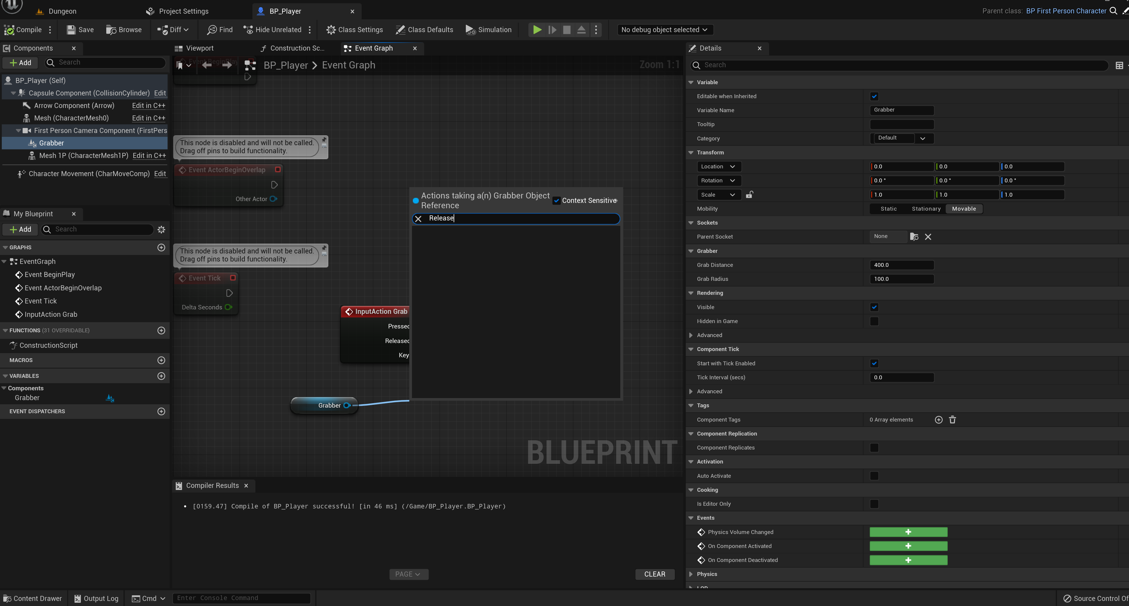 I’ve done a Rebuild in vs2022 and removed/readded the Grabber component to the BP_Player camera and recompiled the blueprint. restarted a few times and still nothing.