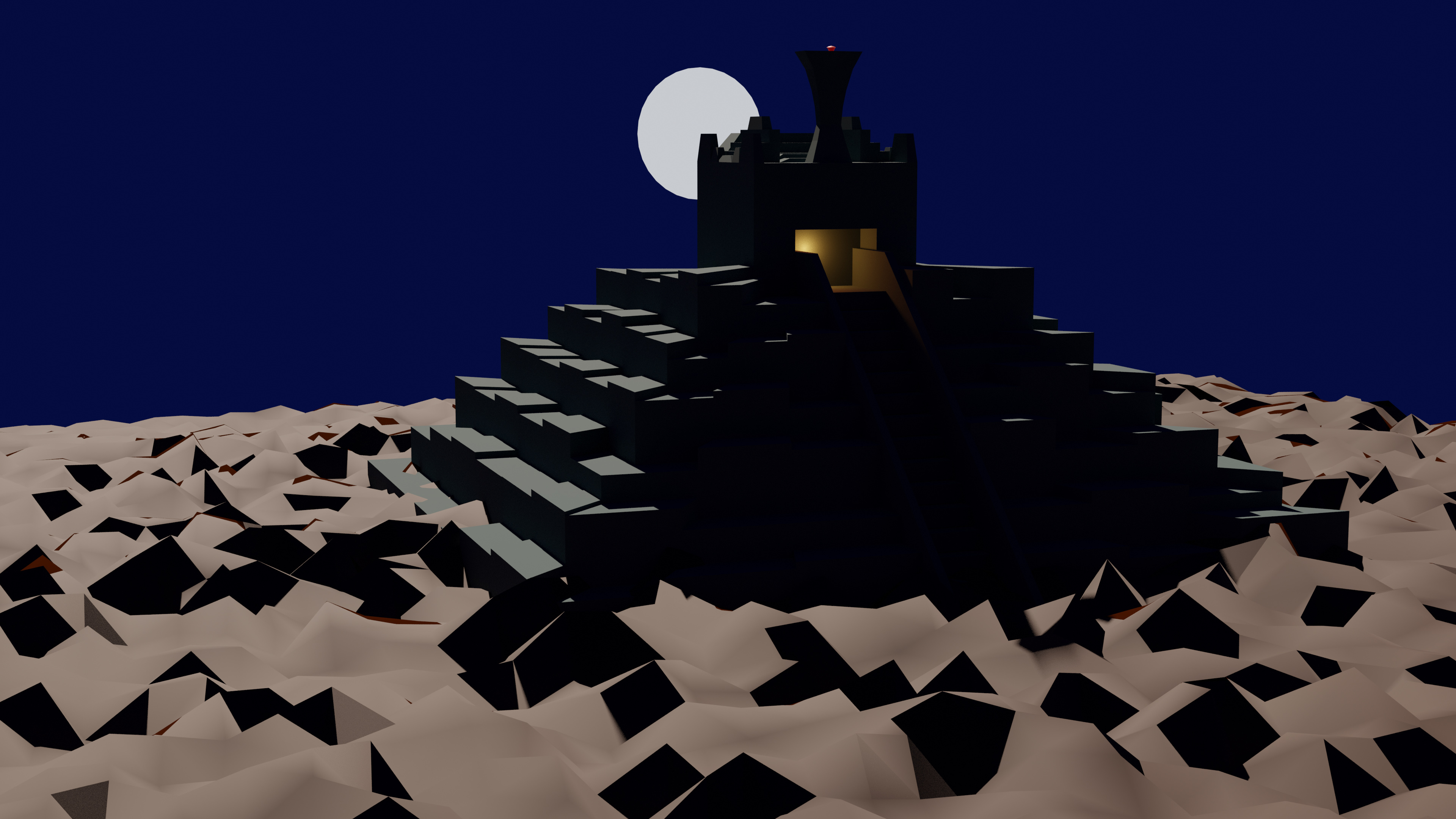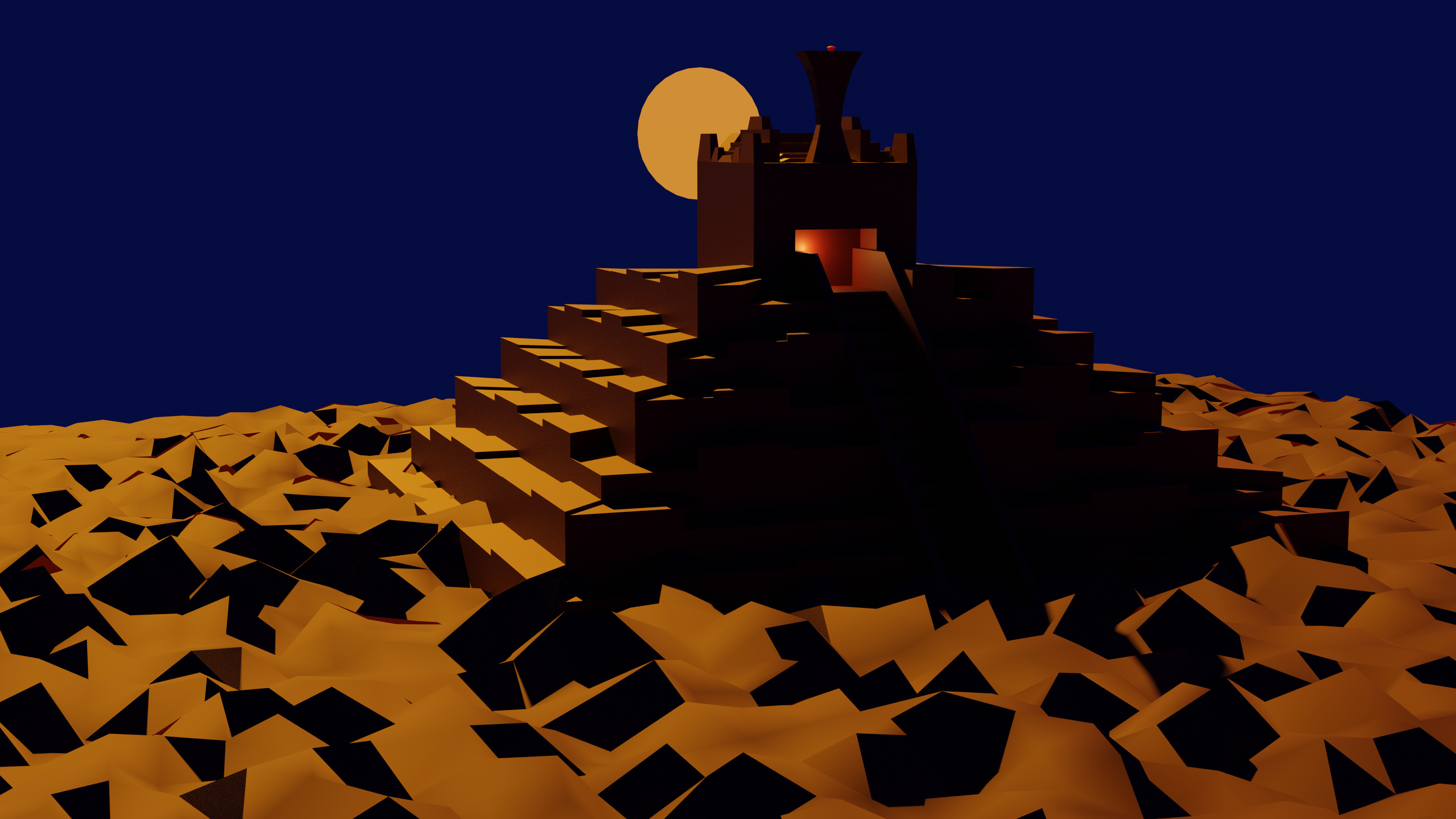 First of all. Love the pyramid! And I will also say I am no expert. But! Lighting is a weird subject haha. Very difficult takes a lot of time to figure out. I’d say definitely go with the white light it’s more realistic. If you want that warmer glow though try putting some more lights in the scene. Always try to stay within like 5% or 10% of absolute white on the color wheel when it comes to light colors. Or at least that’s my experience. Most of the lighting in the real world is not that harsh. Definitely try throwing some lights around in the scene though. Some times I’ll literally accidently place a light some where or turn the brightness way up and it actually looks really cool. Deffinetly look into the lighting settings in Blender. The lighting in a scene can take a model to the next level. Keep up the great work!