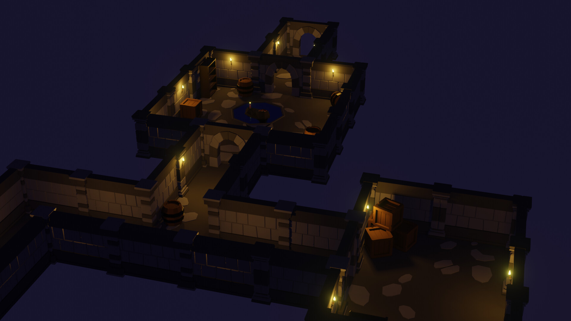 I used the lessons learned in this module to create the water feature and shelves and they both turned out really well. I’ll probably add more to this scene as I learn more, it’s just a lot of fun to add to.