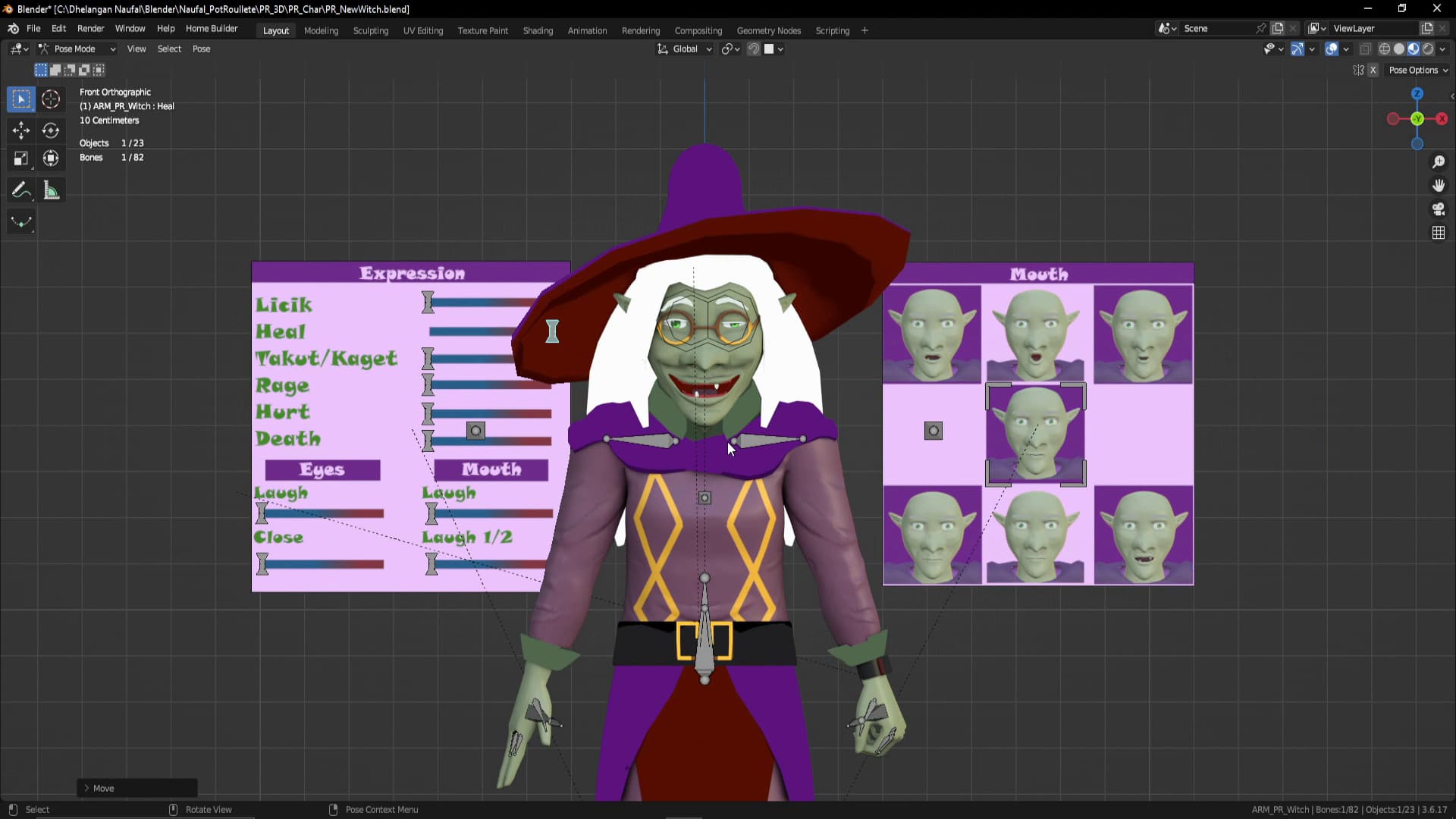The right bone controller (right picture) is for Mouth control. Like saying consonant or vocal mouth shapes. And the left bones are to control The Witch’s expressions.