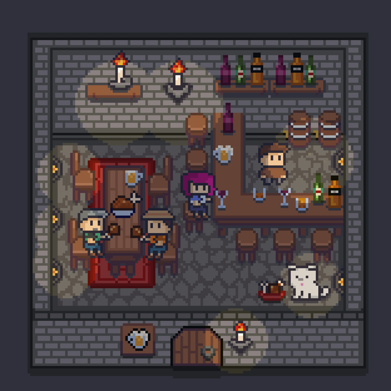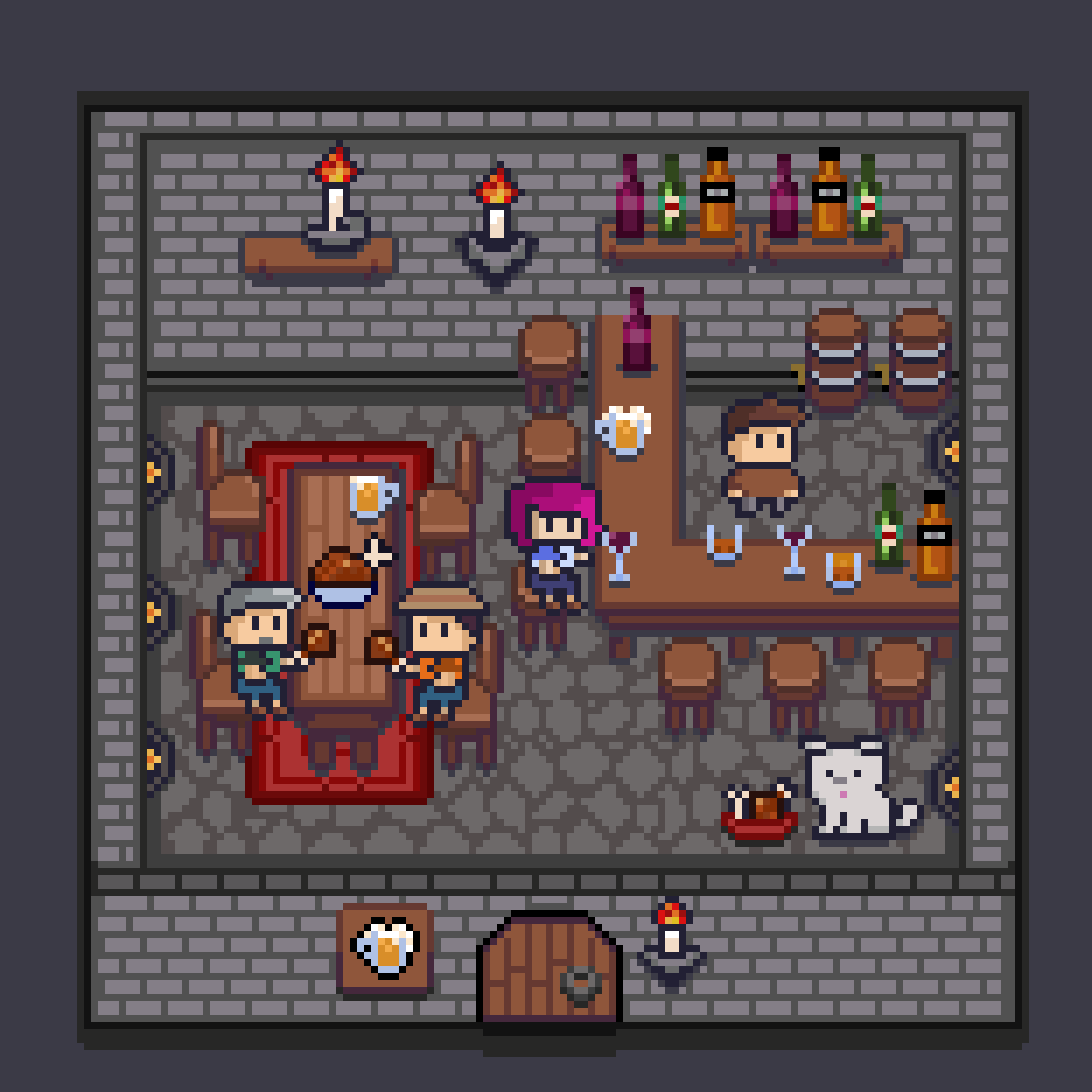 This is my final scene layout from the last challenge of the course. Day and night scene. It is my tavern open for business! I had so much fun making this! I feel happy to have started trying to learn pixel art.