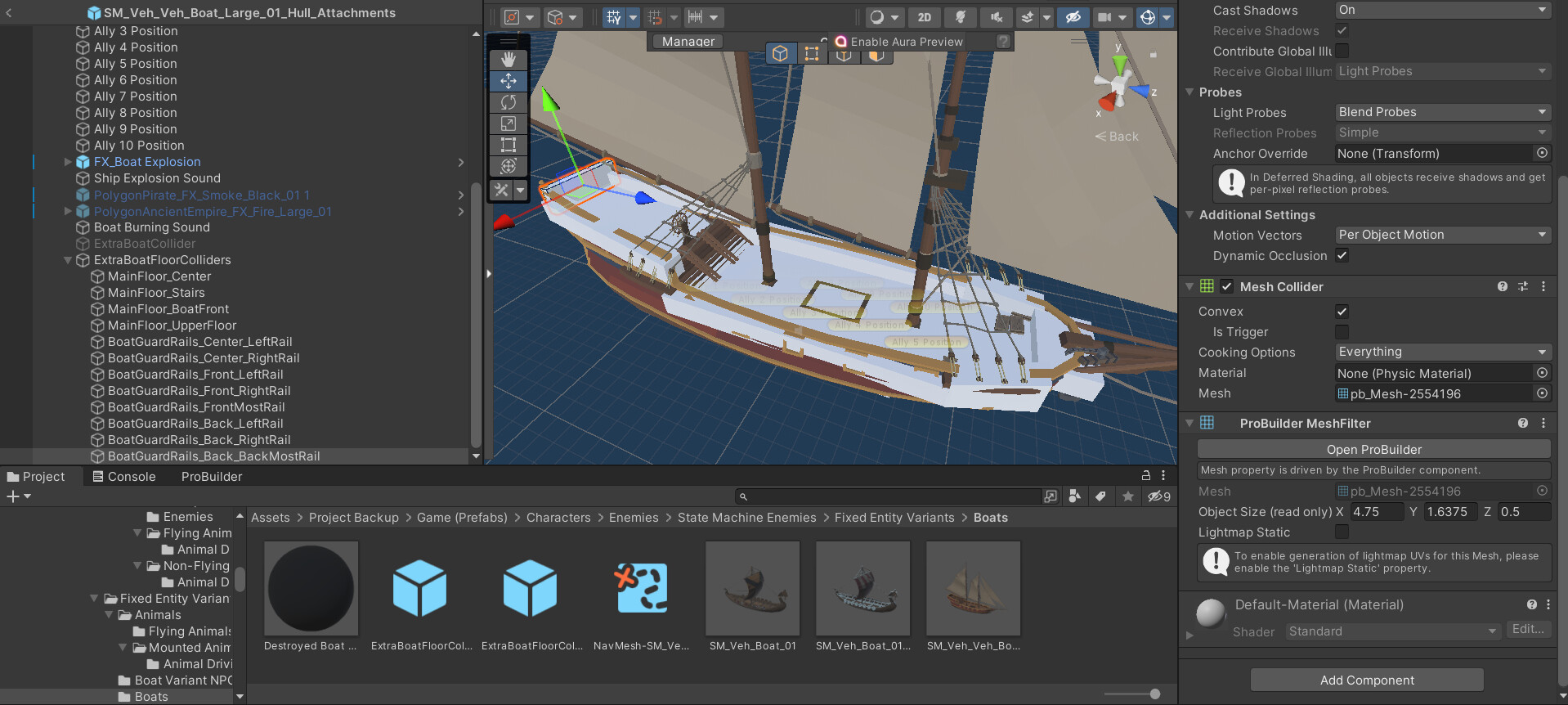To solve that, I got ProBuilder and started mocking up meshes to go with the boat (a box collider won’t cut it). The problem I have is, Unity treats ProBuilder MeshColliders with ‘Convex’ turned on (it must be turned on to stop the player and other NPCs from falling through the boat) as “The highest vertex point is where everyone must stand now”, rather than going “just make sure everyone sits like a normal person on the geometry”, as you can see marked by the Red Arrow in the image below: