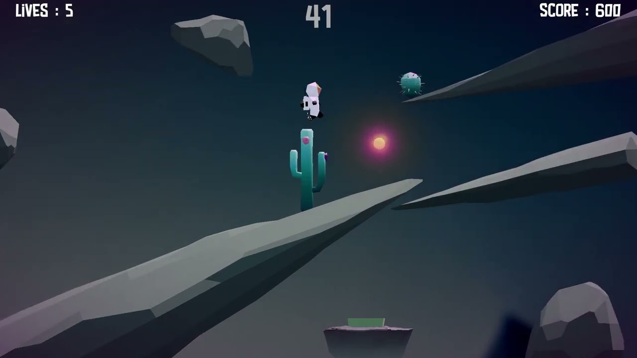 The background artwork is used across two levels and was created using MidJourney’s AI system. I added a menu, lives, a timer, a waypoint system, collectables, music and a scoring system. The timer increases each time a “pod” is collected.