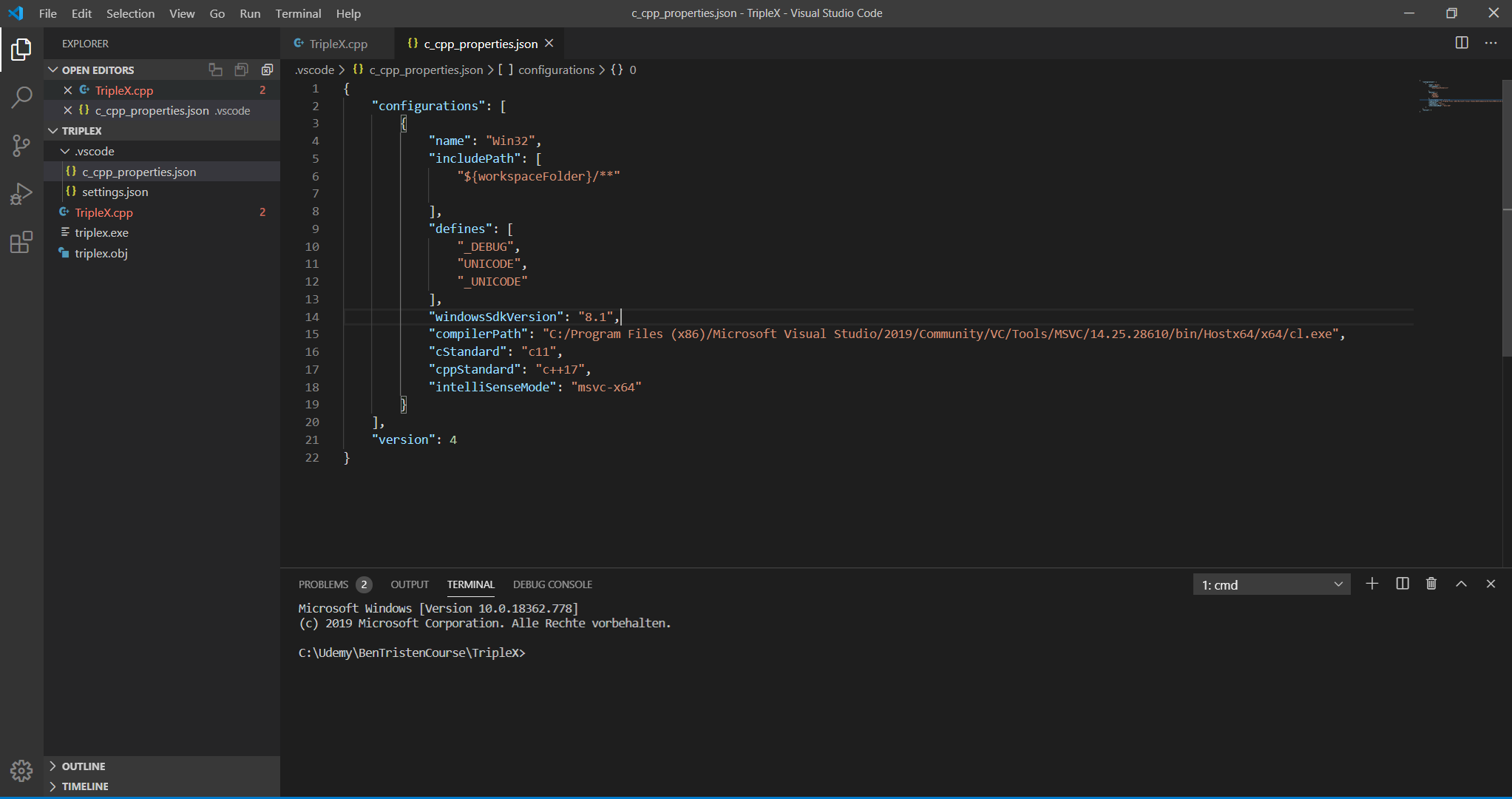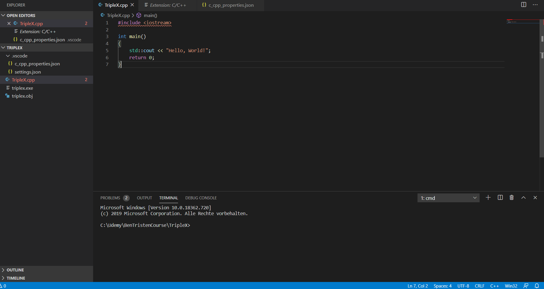 Yes, I was able to compile using cl triplex.cpp /Ehsc and run the programm afterwards. The red underlinings are still present though… I’m guessing I can continue the course without any issues?