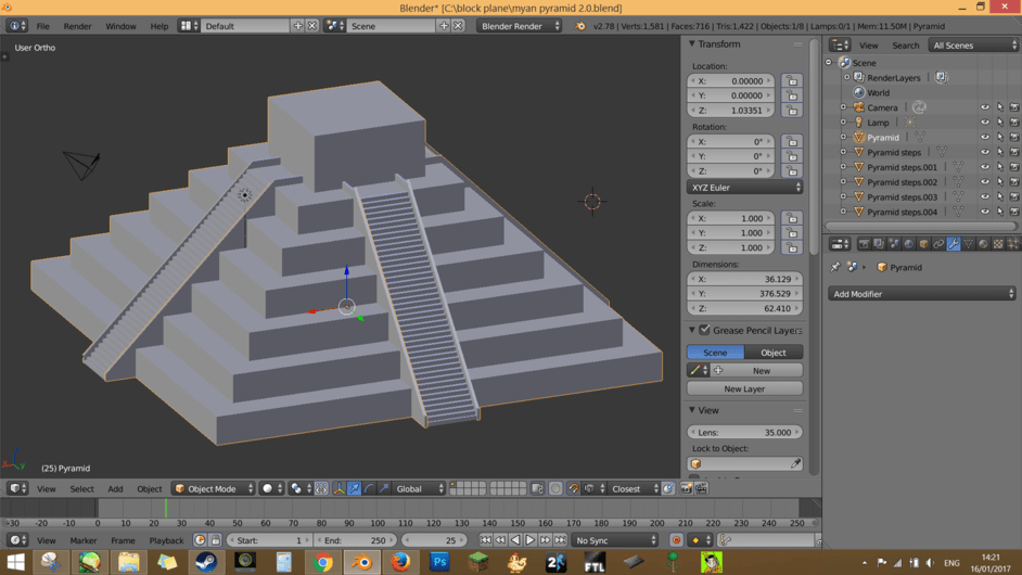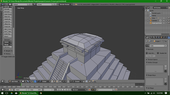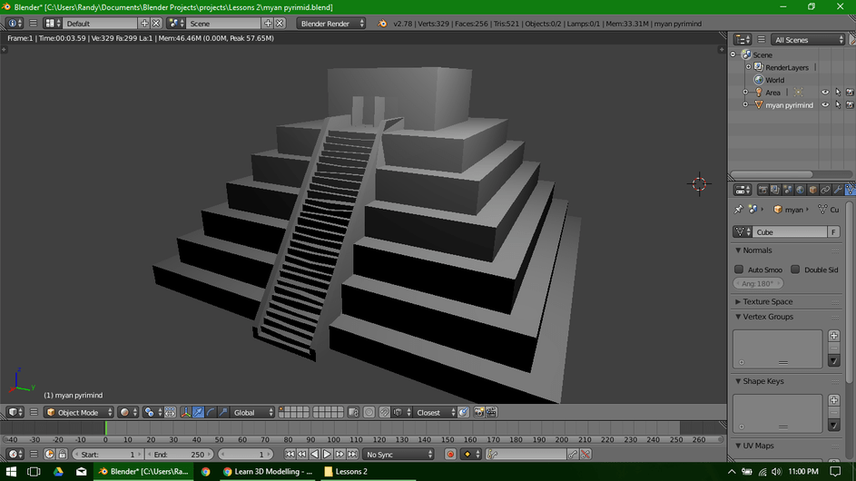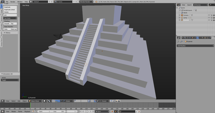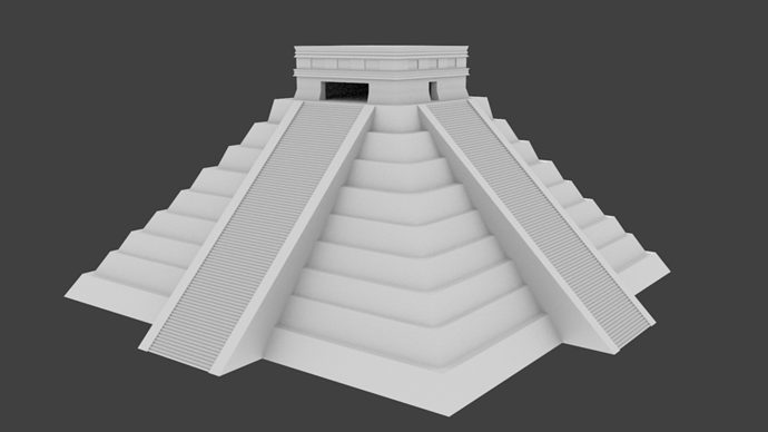 Here is a WIP of my model of the Kukulkan Pyramid in Chichen Itza, Mexico. As you might have guessed, I’m not new to 3D modeling, but I’ve only been using Blender for for a few hours at this point. Still getting used to the interface and where all the tools I like to use are.