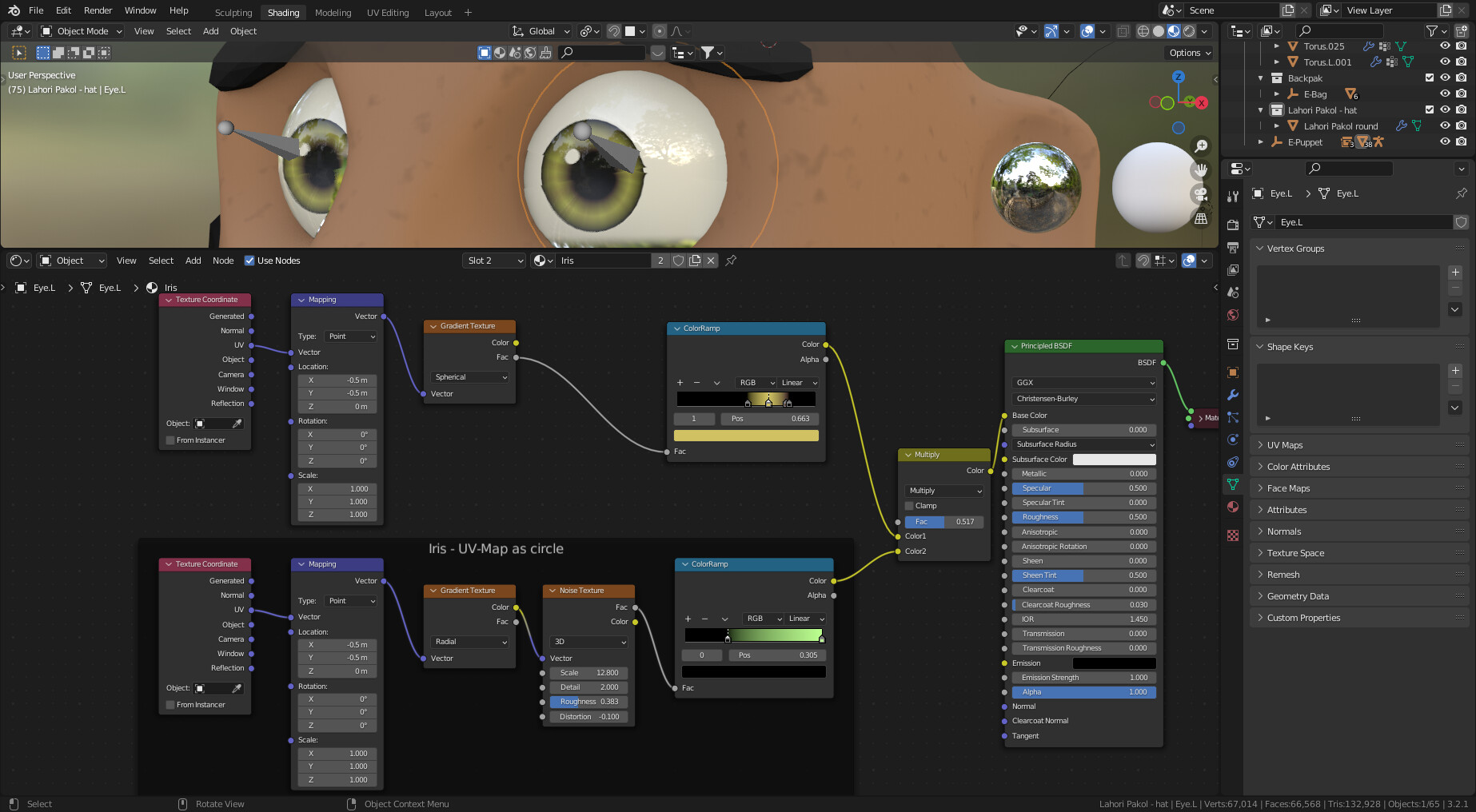 The eye is separated into three parts, the iris (color part of the eye), the sclera (white outer part), and the cornea (glossy layer over eye). The iris has a displacement map on it, the veins are procedurally generated. I’m satisfied with how it turned out! (but I have a feeling that I’m never going to be done tinkering with the details )