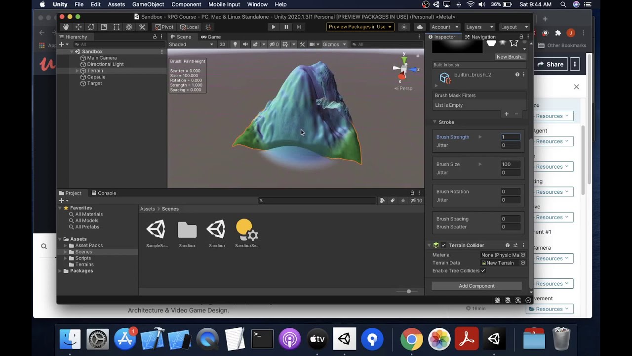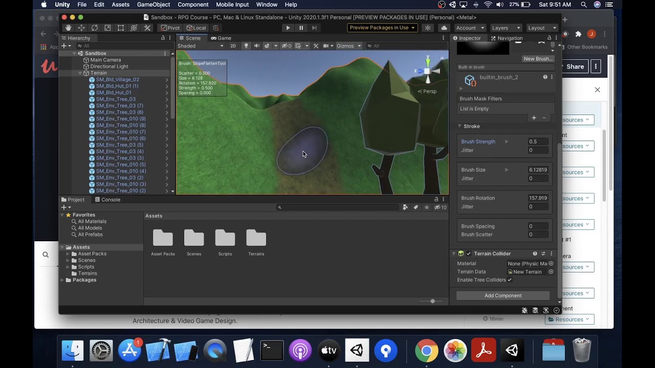 I was struggling a bit with the terrain tools to create gradual slopes to the houses and a level path through the mountains. So for a fun side quest, check out the Terrain Tools preview package: