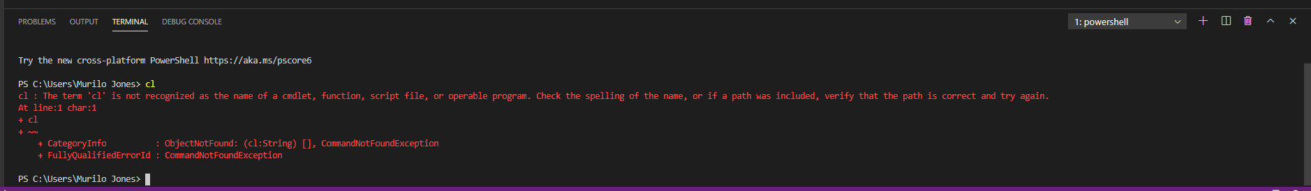 cl : The term ‘cl’ is not recognized as the name of a cmdlet, function, script file, or operable program. Check the spelling of the