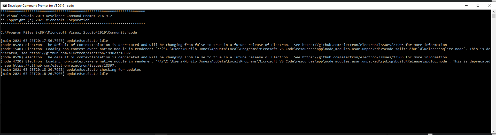 edit: I also noticed that when I type code in the developers command prompt, and press enter, the prompt window shows some stuff that the instructor does not show: