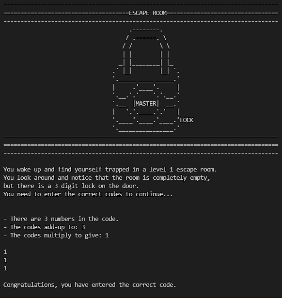 This is my result of the TripleX terminal game. I have added some ASCII art to make it all look a bit more nice.