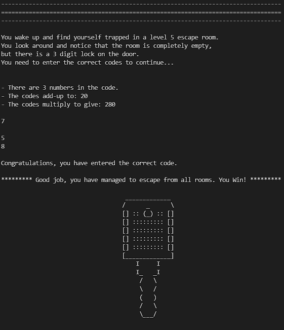 std::cout << "\n********* Good job, you have managed to escape from all rooms. You Win! *********\n";