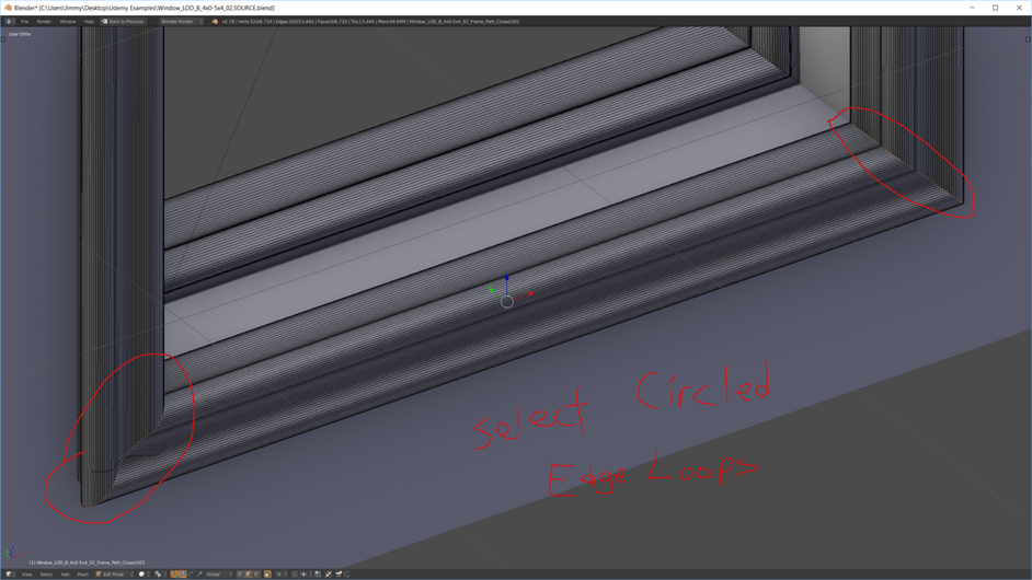 Or you can grab the inner edge of the window to the corners using the Median Point and scale it smaller on the X-axis. And then grab the outer (bottom) edge to the corners and scale them larger on the X-axis.