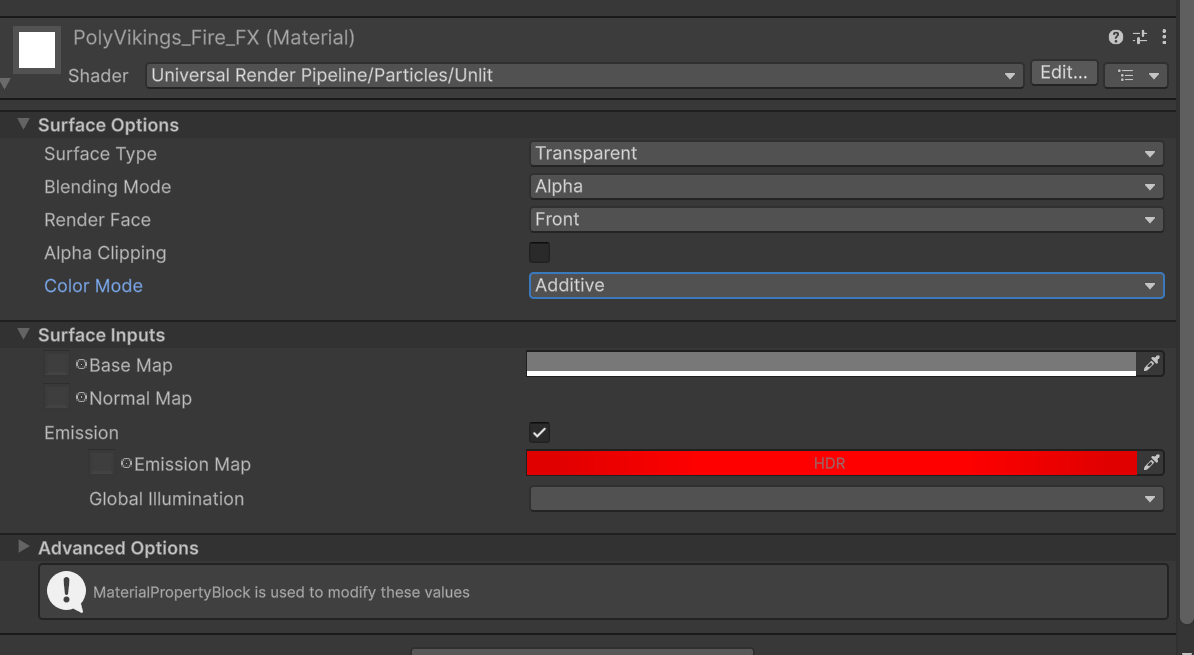 Open the PolyVikings_Fire_FX material, and change the shader option to Universal Render Pipeline, Particles/Unlit, then make the surface options match the image below. There is no image for the basemap or normal map, just set the color to soemthing like I’ve set it. Check the Emission box and adjust the emission map color to your liking. You can see the final effect by opening the FireFx prefab in the prefabs section of the Polygon Student Samples.