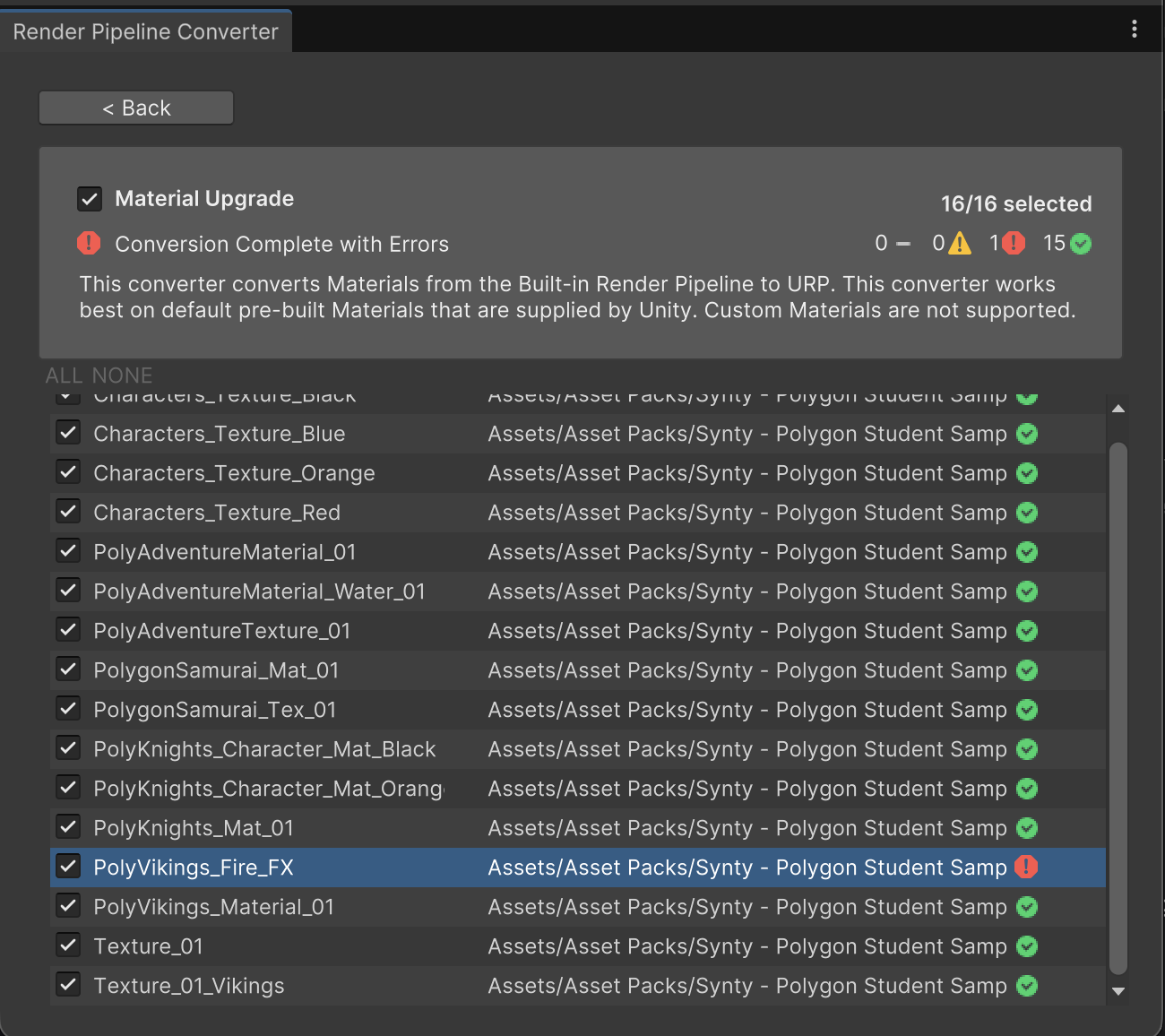Note that this process doesn’t work for all materials, only materials made with the standard shaders in the old Built in render pipeline. It doesn’t work for custom shaders. The good news, however, is that in this course, all of the assets we provide are using the standard shaders and can be easiliy converted with this process.