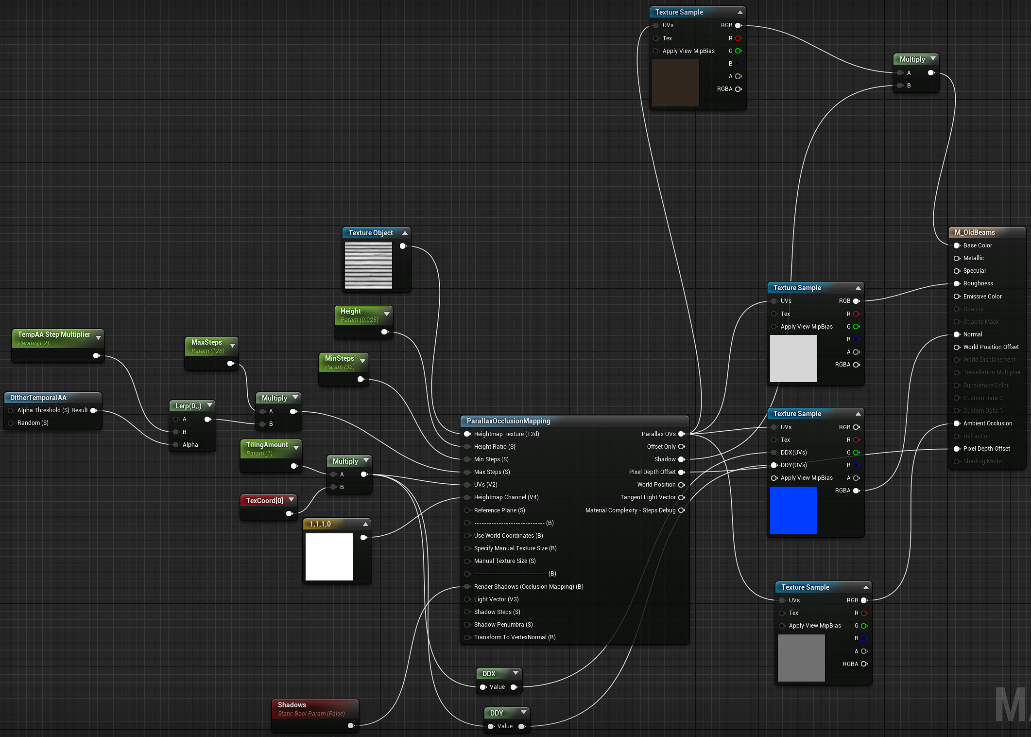 Issue appears to be related to using a 2D mesh and parallax occlusion mapping (my guess anyway). I took the ceiling mesh from the free dungeon assets and applied a material I made from textures I downloaded. The depth offset appears to be causing the engine to think there isn’t a wall, even if I set the Z height of the ceiling mesh to be lower than the top of the wall mesh.