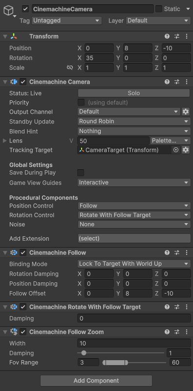 So to start off we will need to create an empty Gameobject and name it CameraTarget, similar to the original tutorial. This will be used as the Transform point, the camera will focus on, and we will change the X-axis rotation to 35 (or whatever angle you find comfortable with and we can also hard-code it into our script). Next we will add a Cinemachine Camera (no longer a Cinemachine virtual camera) and add the following settings. (Note the Cinemachine Follow Zoom component, as we will reference that in our new script).