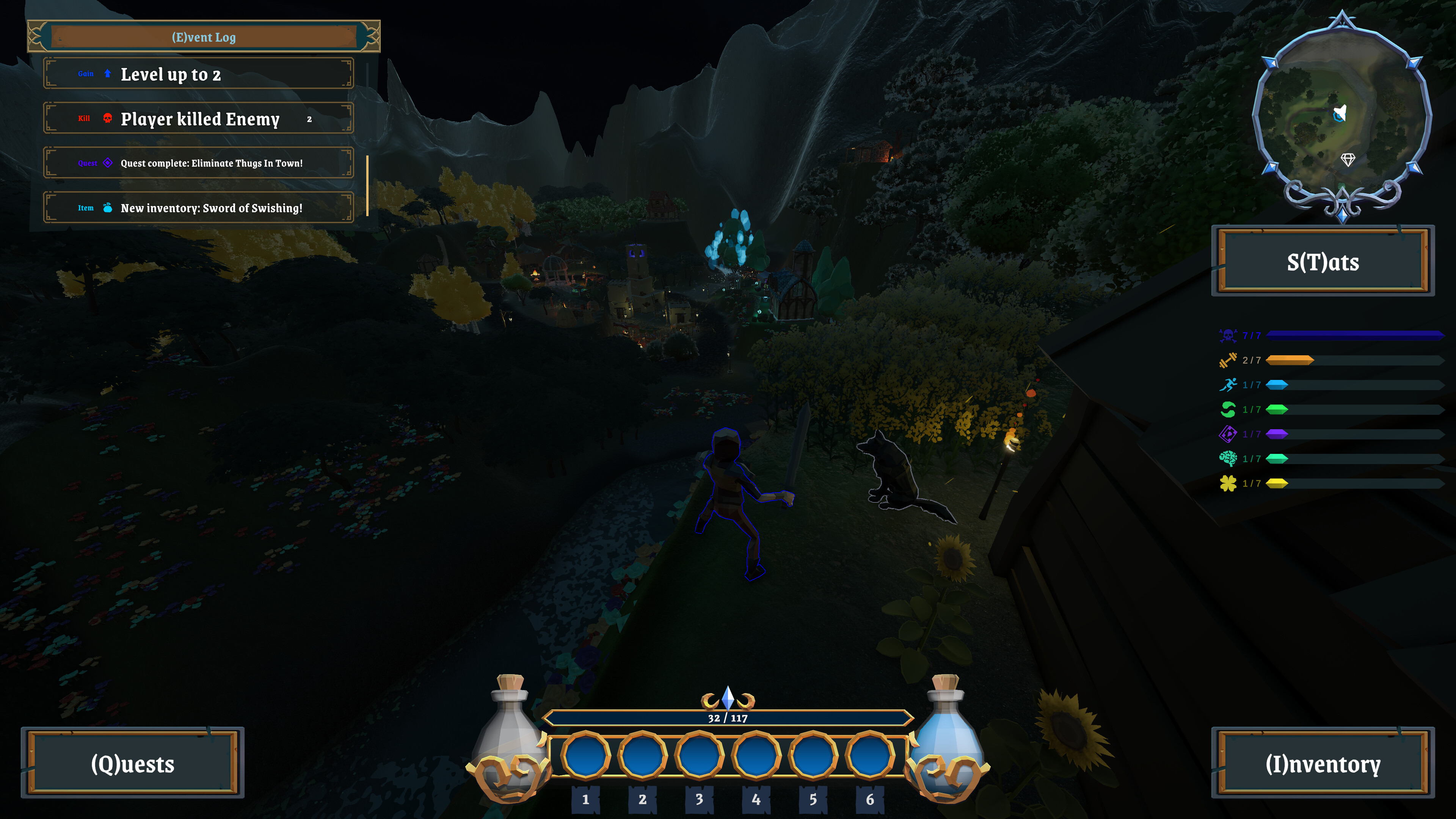 Another screenshot from work in progress game. I tore up and redid a lot of it since the prior screenshots (Work in progress: RPG after taking four-course sequence - #2 by daberny) (I do that a lot…I’d have trouble working for a boss who wants efficiency). Again, am mostly going on my own but roughly have implemented the work of Core Combat, Inventory, and Dialog/Quests courses (having followed all four courses a couple years ago) though some features of those courses are still in progress. I also got ideas from outside sources (e.g. this guy’s YouTube channel: https://www.youtube.com/@ShapedByRainStudios/videos).